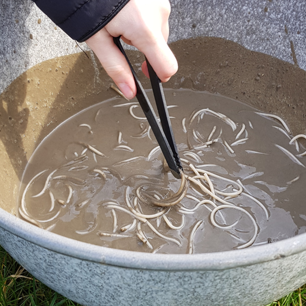 Kook spaghetti en gebruik het als wormen in de modder. Haal de 'wormen' (slierten spaghetti) met een pincet uit de modder.