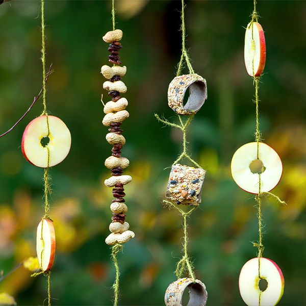 Rijg voedsel aan een ketting om de vogels te kunnen voeden